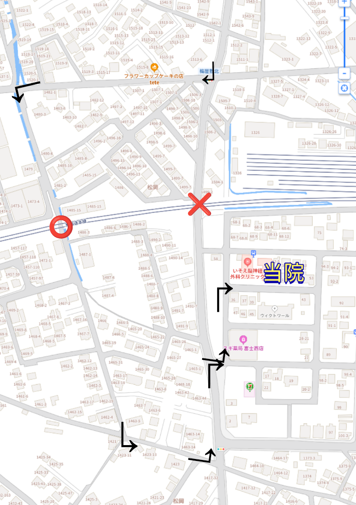 旧国1〈富士宮・富士川方面〉から来られるクライアント様は別添地図のように1つ西側の踏切に迂回してお越しください。